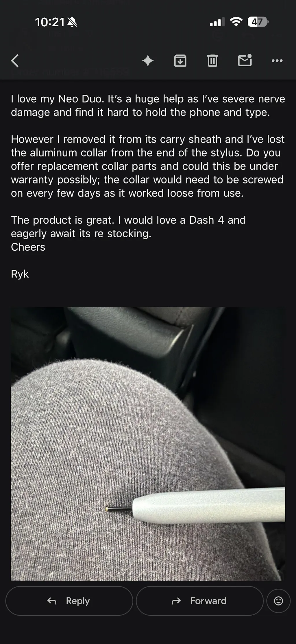 However I removed it from its carry sheath and I've lost the aluminum collar from the end of the stylus. Do you offer replacement collar parts and could this be under warranty possibly; the collar would need to be screwed on every few days as it worked loose from use.